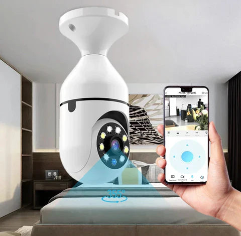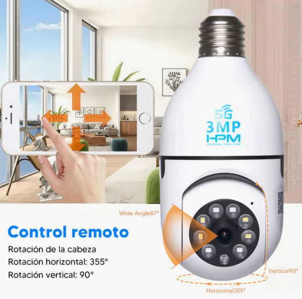La Cámara Bombillo 360° combina la potencia de una lámpara LED con una cámara Full HD que graba día y noche, detecta movimiento y te envía alertas en tiempo real.