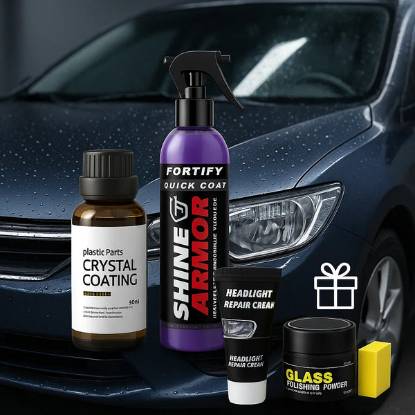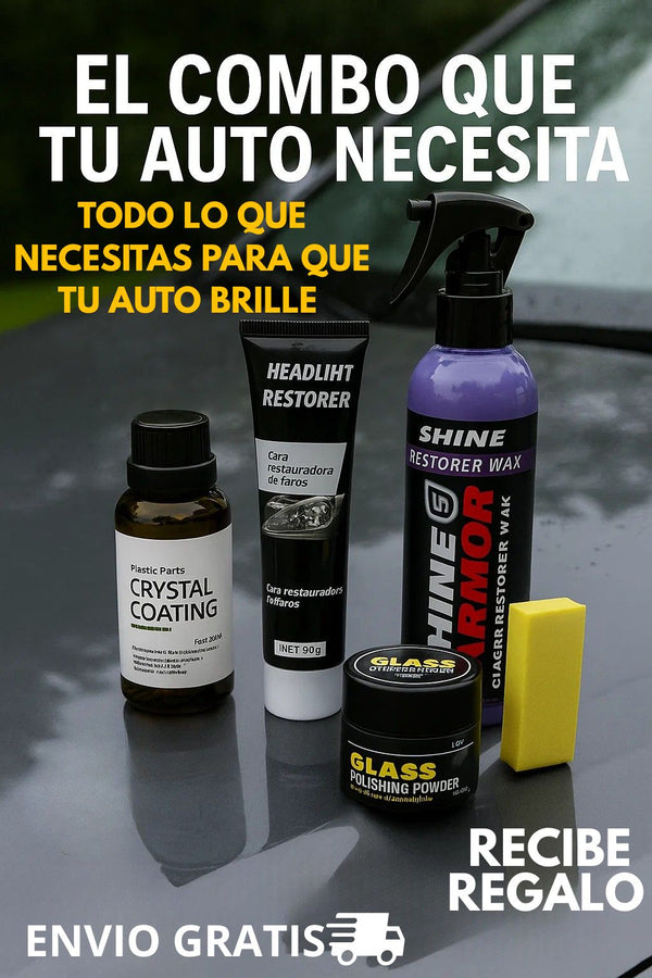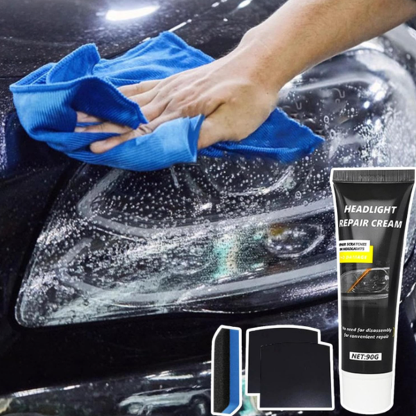 🔹 Crema Restauradora de Faros: Líquido pulidor que elimina neblina, rayones y amarilleo en los faros. Mejora la visibilidad de día y de noche, se aplica fácilmente y deja una capa protectora contra rayos UV y desgaste.