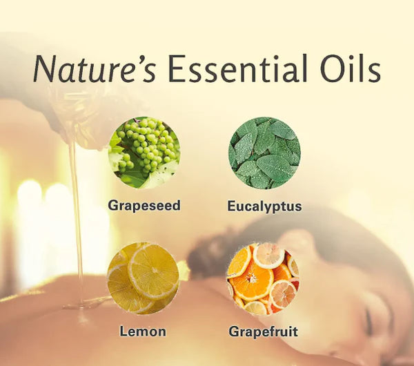 Este aceite combina activos naturales como aceites esenciales de grapefruit, limón, eucalipto y semilla de uva, junto con colágeno vegetal y extractos de células madre vegetales.