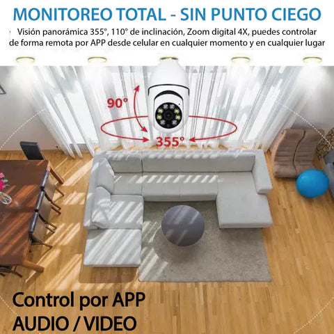 La Cámara Bombillo 360° combina la potencia de una lámpara LED con una cámara Full HD que graba día y noche, detecta movimiento y te envía alertas en tiempo real.